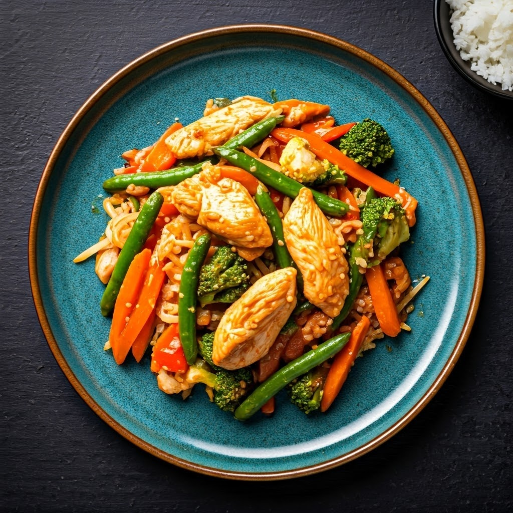 A quick and flavorful spicy chicken stir-fry with vibrant vegetables.